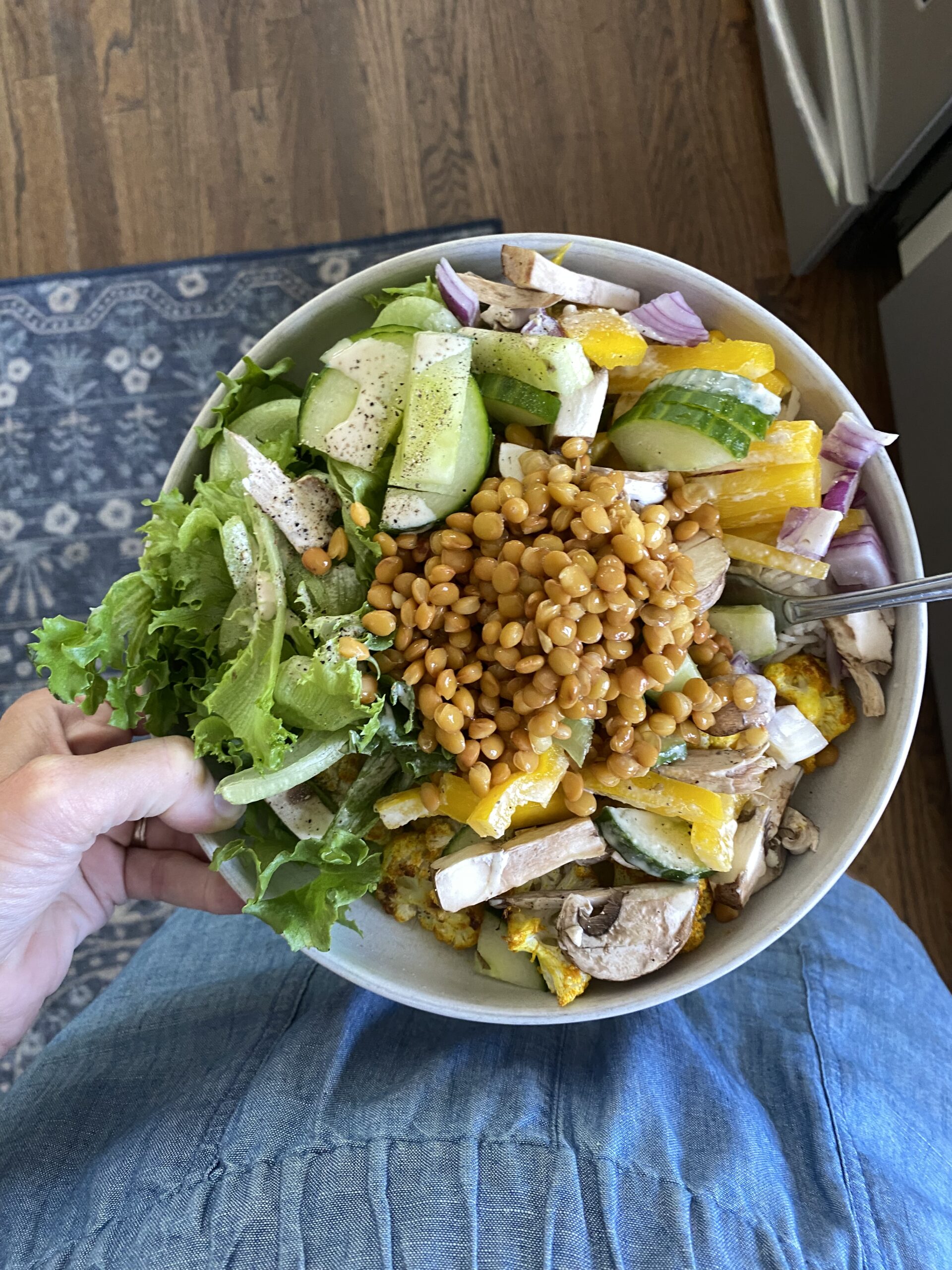 Big nourish bowl with greens, lentils, rice, cauliflower, chopped veggies and a tahini-lemon dressing.
